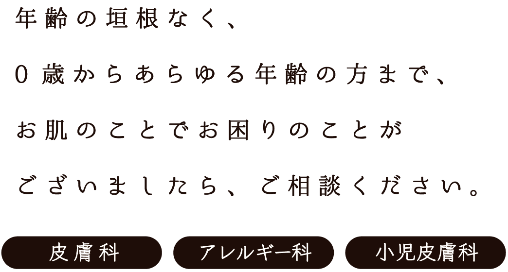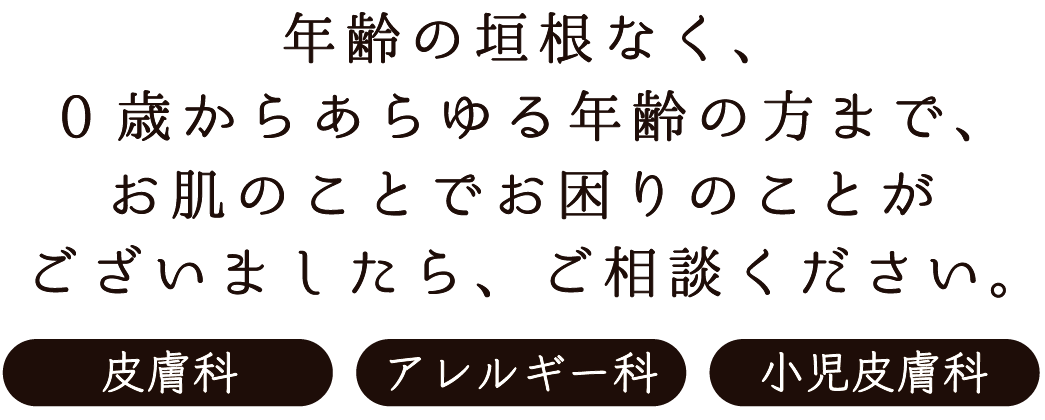 アトピー、じんましん、薬疹、アレルギー、にきび、ヘルペス、乾癬、水疱症、いぼなど、年齢の垣根なく、0歳からあらゆる年齢の方まで、お肌のことでお困りのことがございましたら、ご相談ください。
